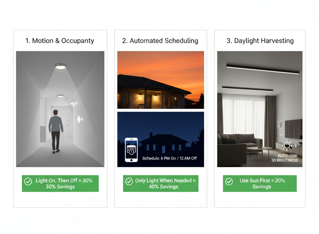 • Dimming: Reducing a light’s brightness by just 20% can save a disproportionate amount of energy. Smart dimmers allow granular control via app or voice.